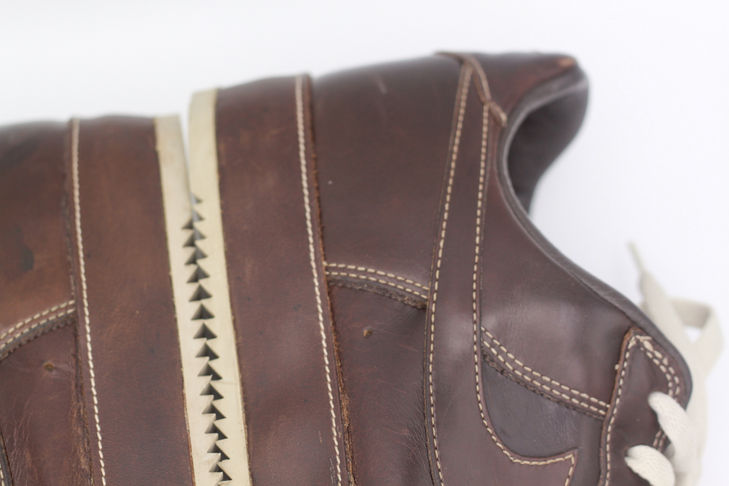 With wear, it was apparent that the foam had been destroyed and plumes of dust formed with every step I took in these. The shoes are roughly 18 years old so only the sidewall stitching was keeping the cup sole attached to the upper. Once the stitching was carefully removed with a seam ripper, the disintegrated EVA midsole and air unit were revealed. The air unit was surprisingly not brittle but had developed a few cracks where the air ultimately escaped. I had originally planned to replace the midsole using components from a donor pair of Air Force 1's. However, I decided to challenge myself instead by creating a bespoke midsole and outsole combination. From previous tote bag projects, I had various 4-5oz leather straps in a natural veg tan and a brown oil-tanned leather from Crazy Horse. The brown strap matched the upper quite well and just looked more lux than the veg tan strap.